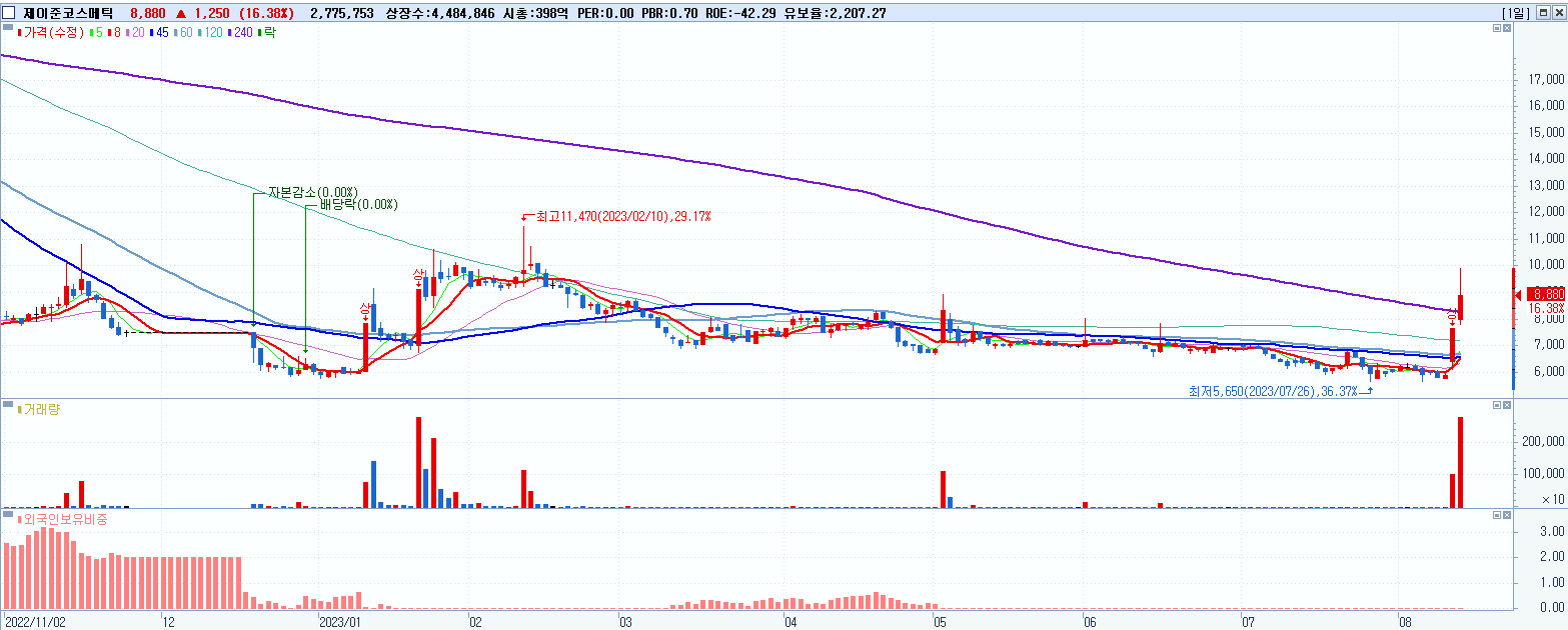 - 제이준코스메틱 (16.38%, 시총: 398억, 거래량: 2,776,703, 거래대금:259억)
