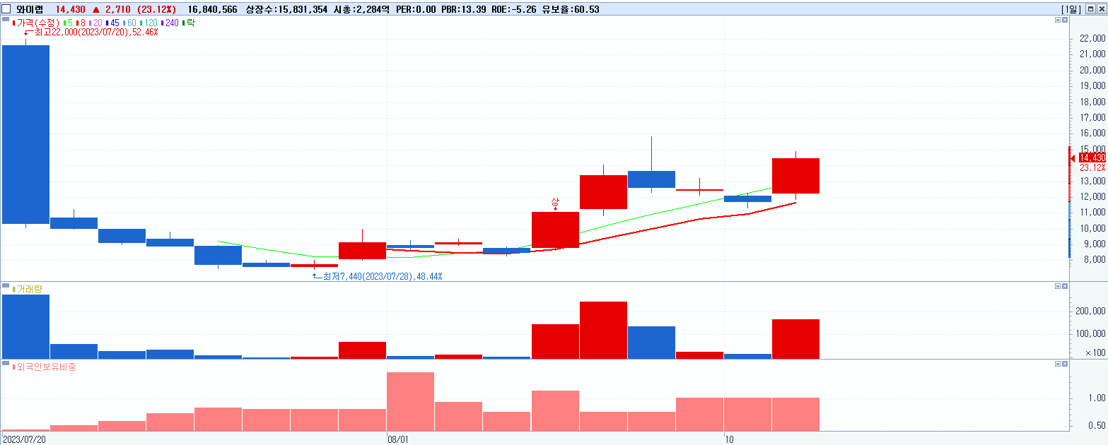 - 와이랩 (23.12%, 시총: 2,284억, 거래량: 16,854,474, 거래대금:2,275억)
