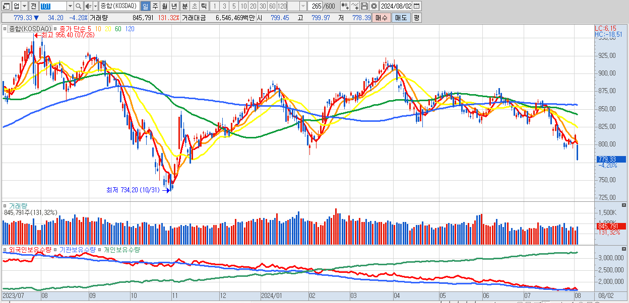 | 08/02 | 779.33 | ▼-4.20% | 2,438억 | -1,505억 | -897억 | -36억 |