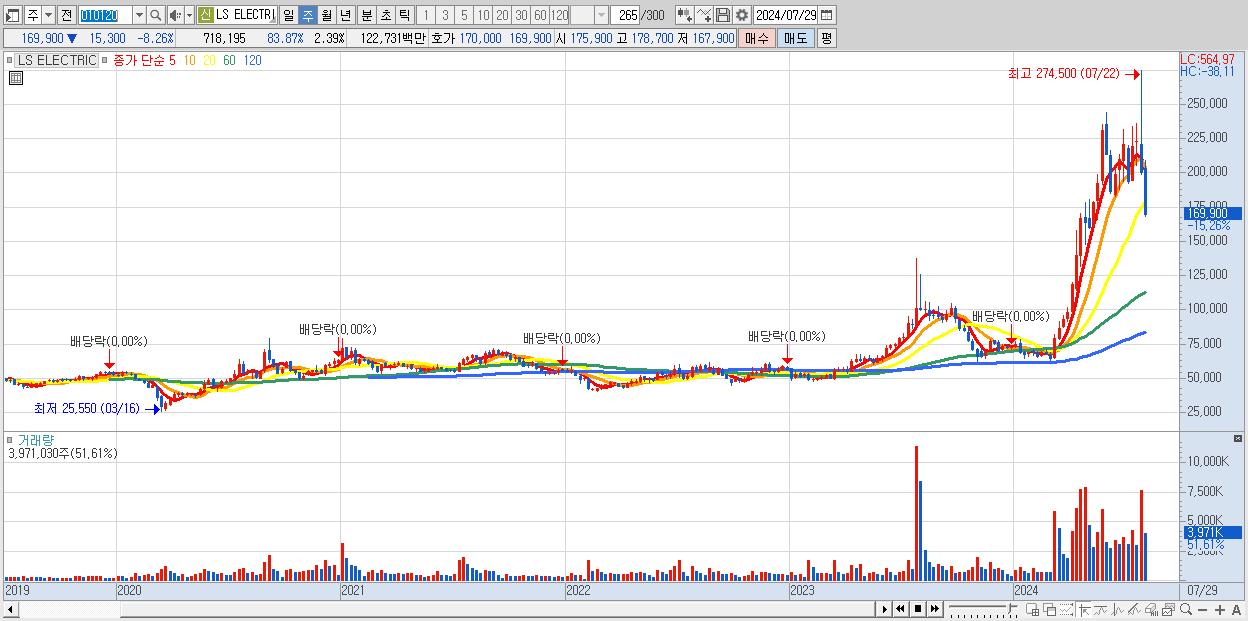 - LS ELECTRIC (169,900원 ▼ -15.26% , 시총: 50,970억, 거래량: 3,971,030, 거래대금:7,430억)