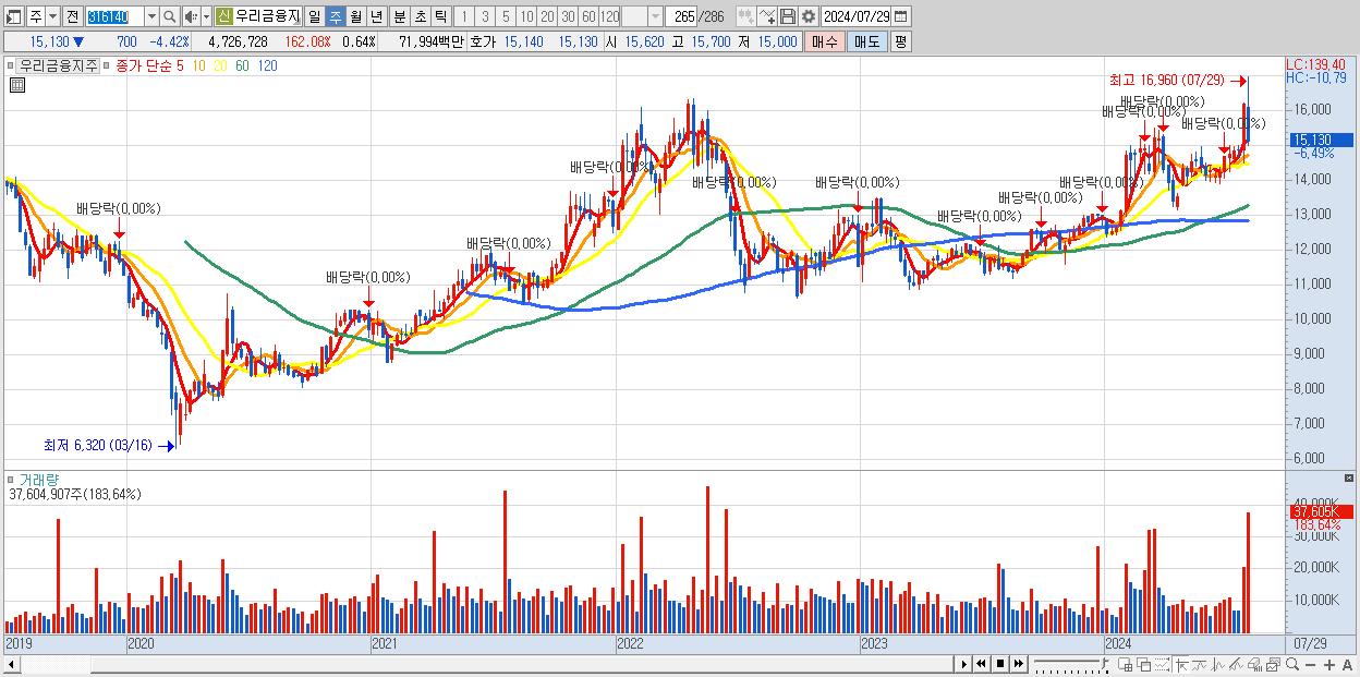 - 우리금융지주 (15,130원 ▼ -6.49% , 시총: 112,354억, 거래량: 37,604,907, 거래대금:5,975억)