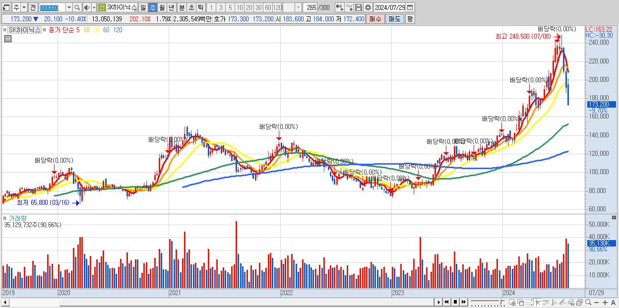 - SK하이닉스 (173,200원 ▼ -9.7% , 시총: 1,260,900억, 거래량: 35,129,732, 거래대금:65,622억)