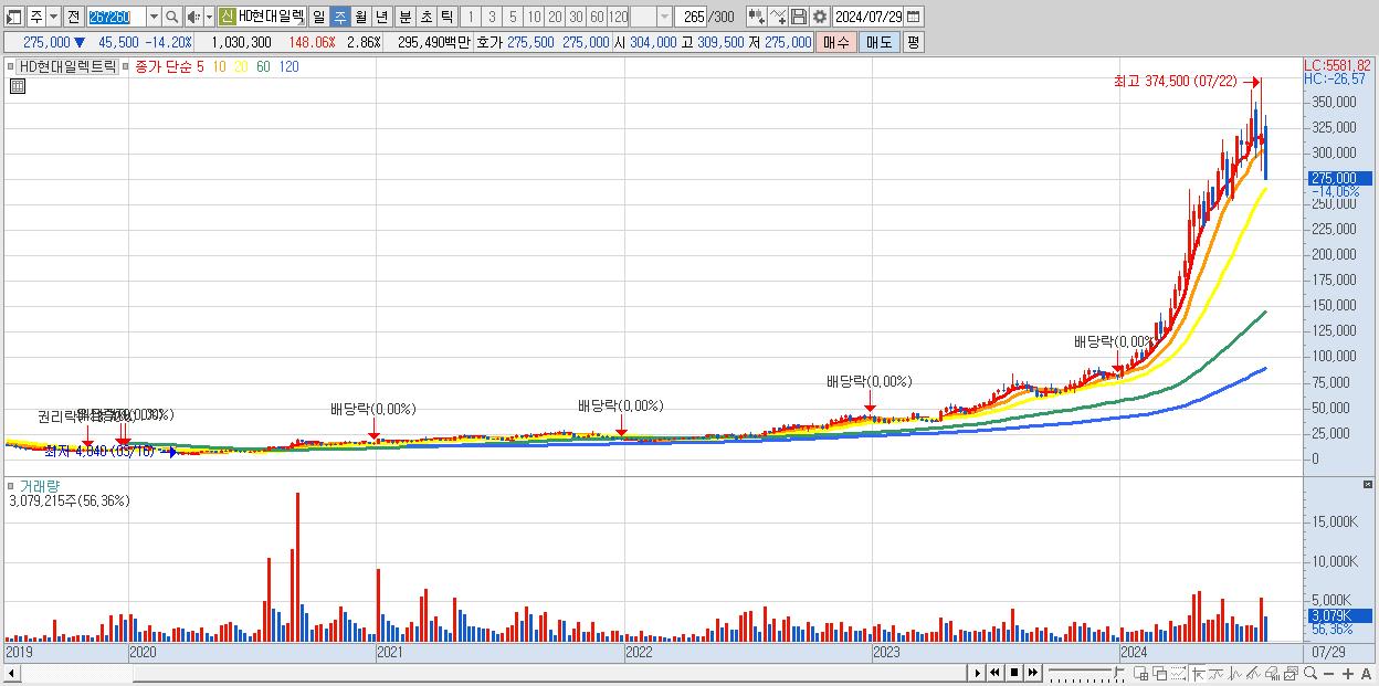 - HD현대일렉트릭 (275,000원 ▼ -14.06% , 시총: 99,130억, 거래량: 3,079,215, 거래대금:9,451억)