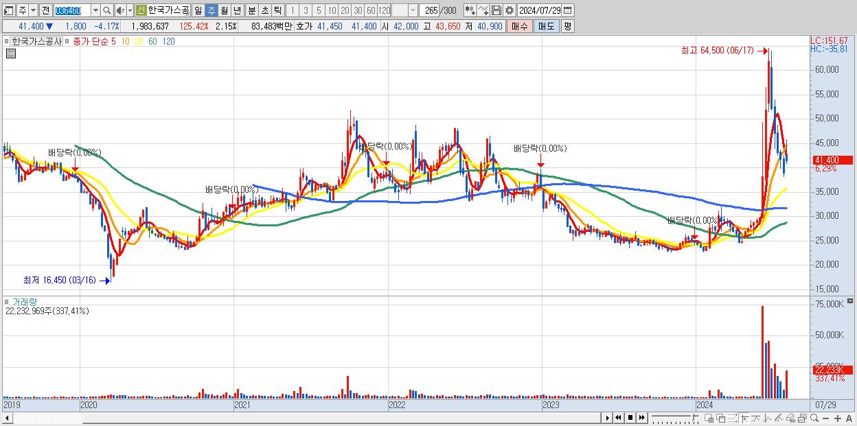 - 한국가스공사 (41,400원 ▲ 6.29% , 시총: 38,218억, 거래량: 22,232,969, 거래대금:9,698억)