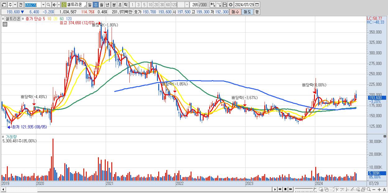 - 셀트리온 (193,600원 ▼ -3.2% , 시총: 420,099억, 거래량: 5,309,481, 거래대금:10,810억)