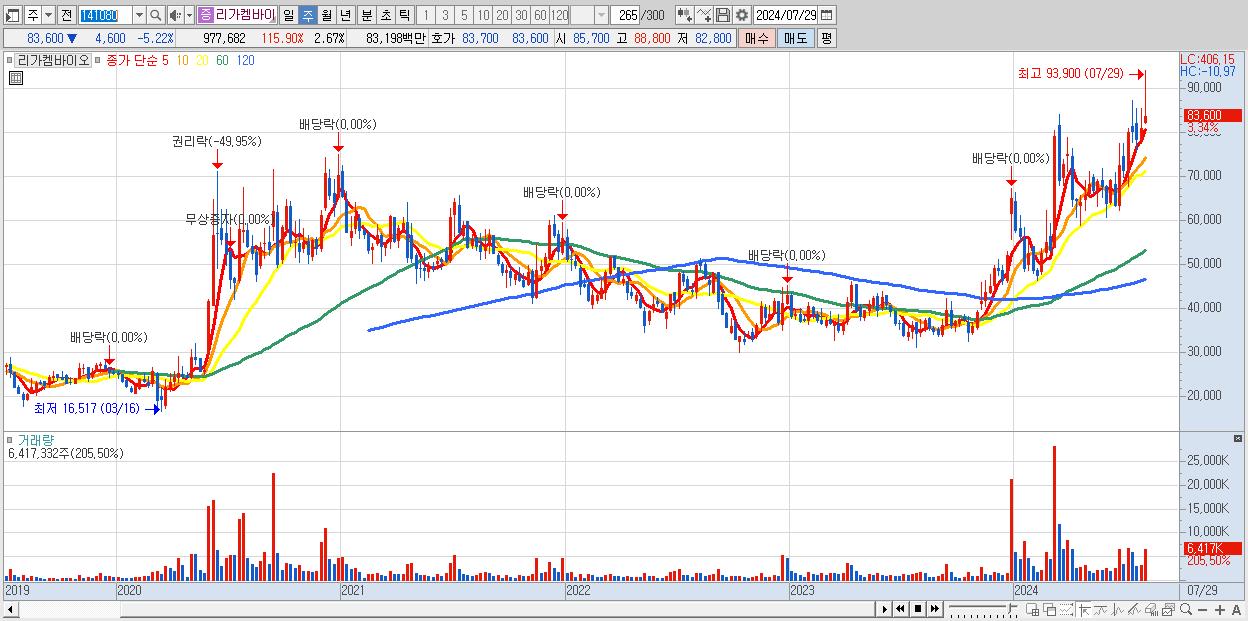 - 리가켐바이오 (83,600원 ▲ 3.34% , 시총: 30,570억, 거래량: 6,417,332, 거래대금:5,609억)