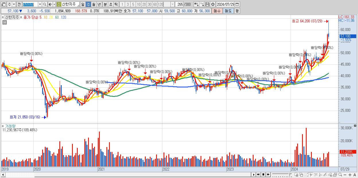 - 신한지주 (57,100원 ▼ -1.55% , 시총: 290,864억, 거래량: 11,230,967, 거래대금:6,746억)