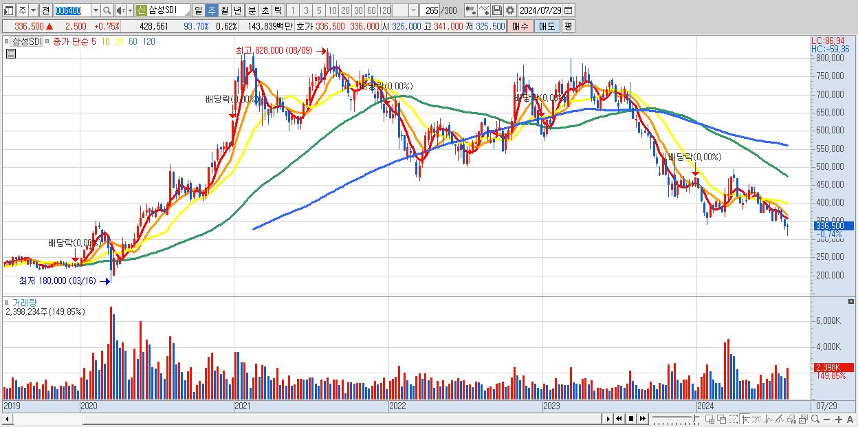 - 삼성SDI (336,500원 ▼ -0.74% , 시총: 231,393억, 거래량: 2,398,234, 거래대금:7,881억)