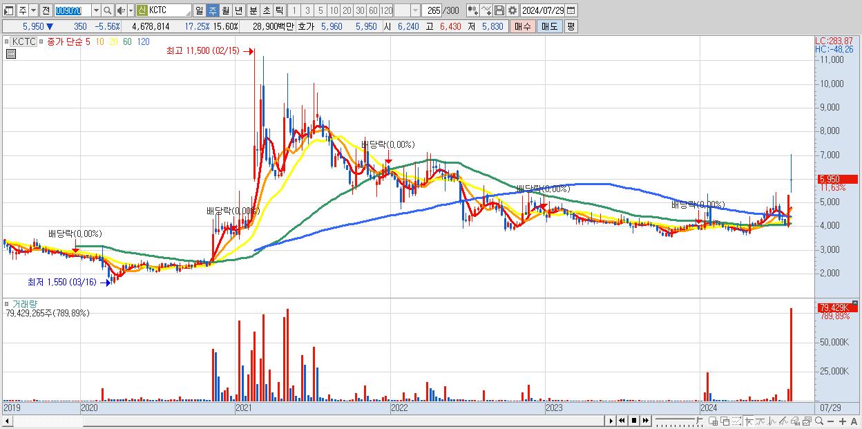 - KCTC (5,950원 ▲ 11.63% , 시총: 1,785억, 거래량: 79,429,265, 거래대금:5,050억)
