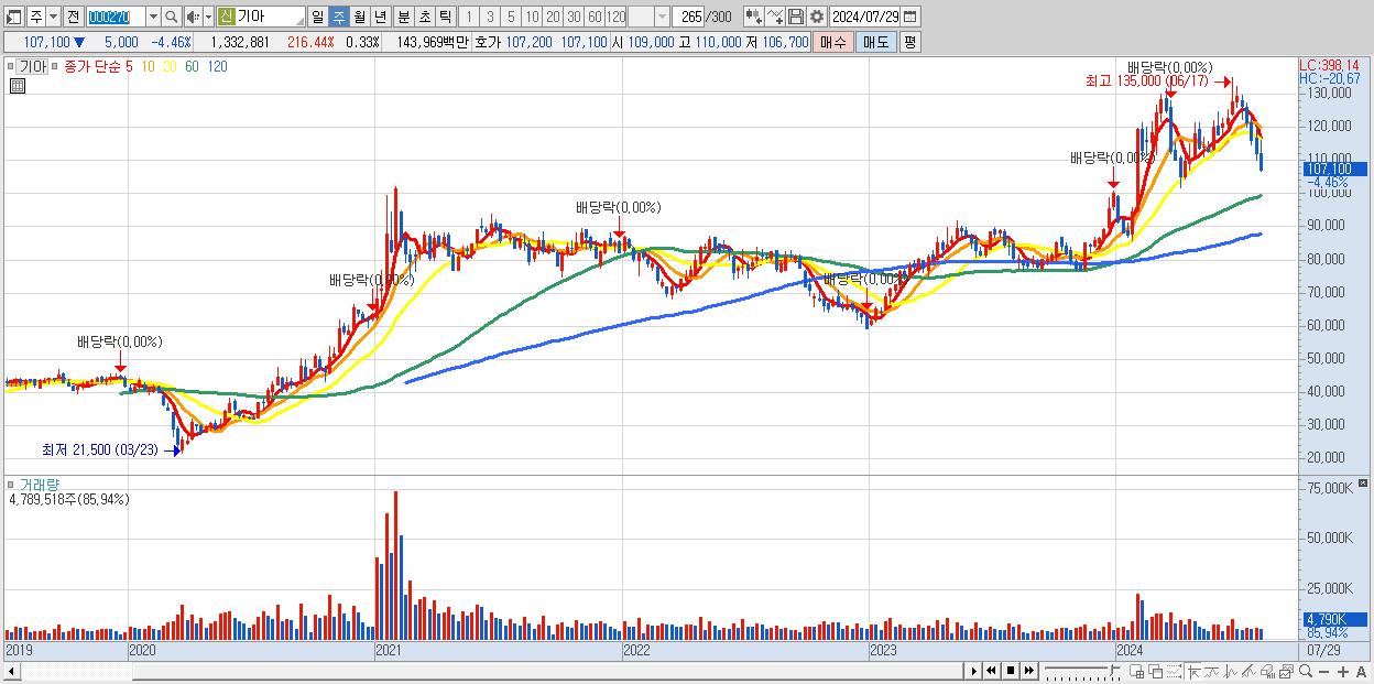 - 기아 (107,100원 ▼ -4.46% , 시총: 428,248억, 거래량: 4,789,518, 거래대금:5,346억)