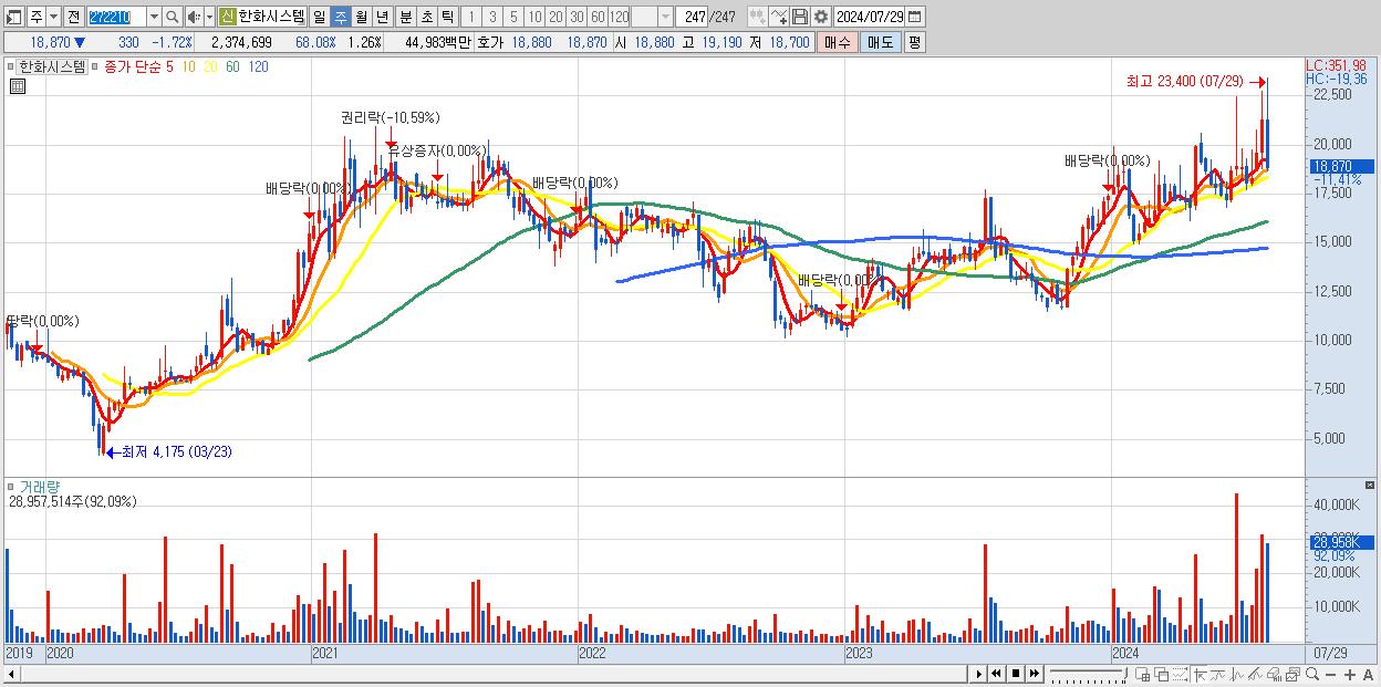 - 한화시스템 (18,870원 ▼ -11.41% , 시총: 35,649억, 거래량: 28,957,514, 거래대금:5,888억)
