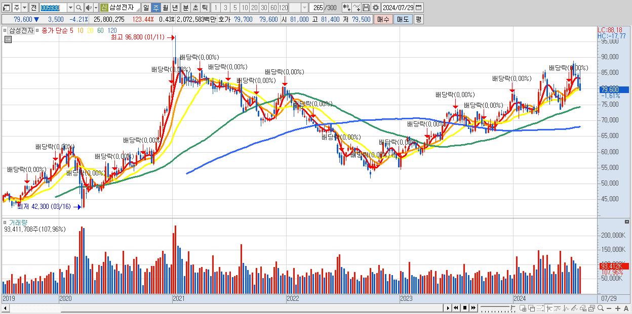 - 삼성전자 (79,600원 ▼ -1.61% , 시총: 4,751,947억, 거래량: 93,411,708, 거래대금:76,447억)