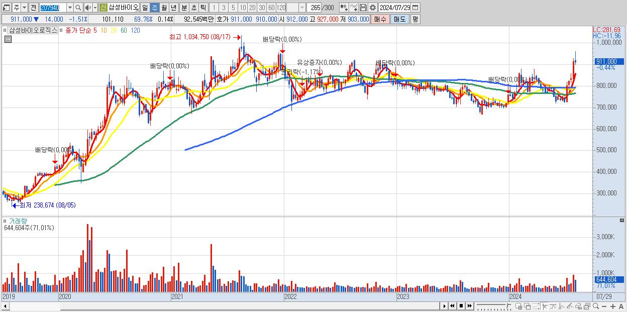 - 삼성바이오로직스 (911,000원 ▼ -0.44% , 시총: 648,395억, 거래량: 644,604, 거래대금:5,990억)