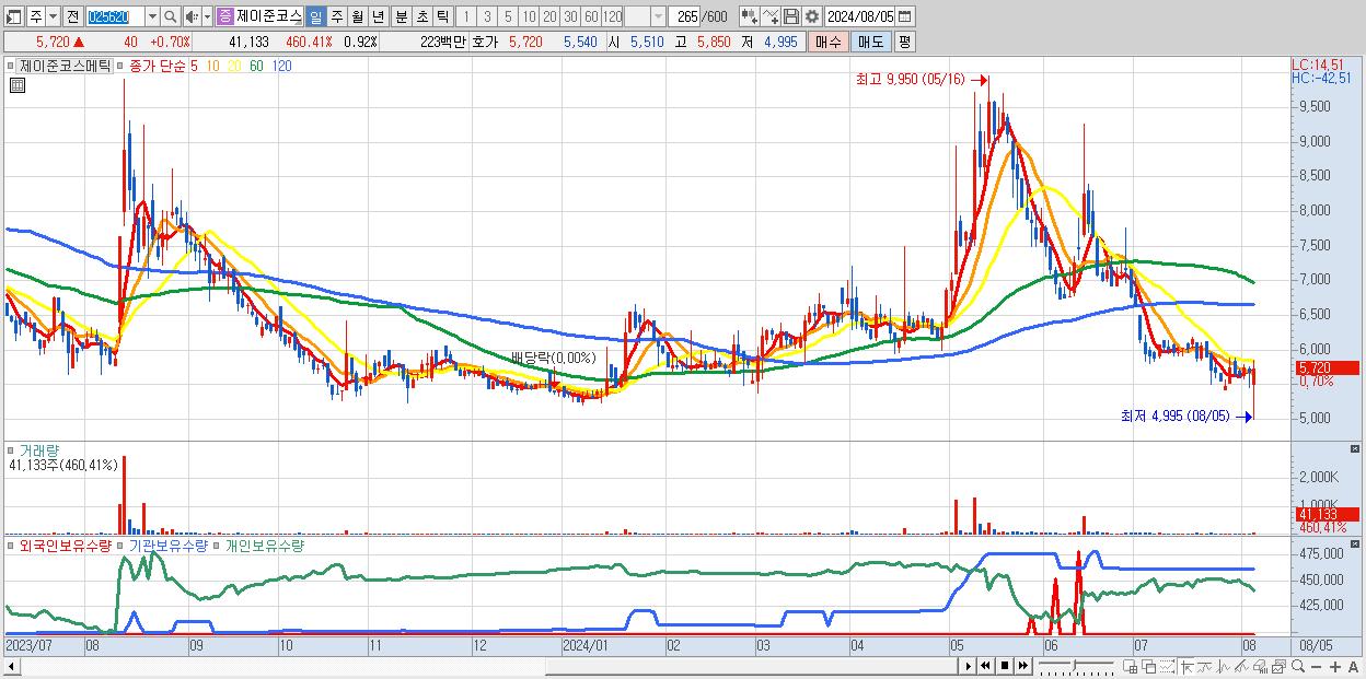 - 제이준코스메틱 (5,720원 ▲ 0.7% , 시총: 257억, 거래량: 41,133, 거래대금:2억)