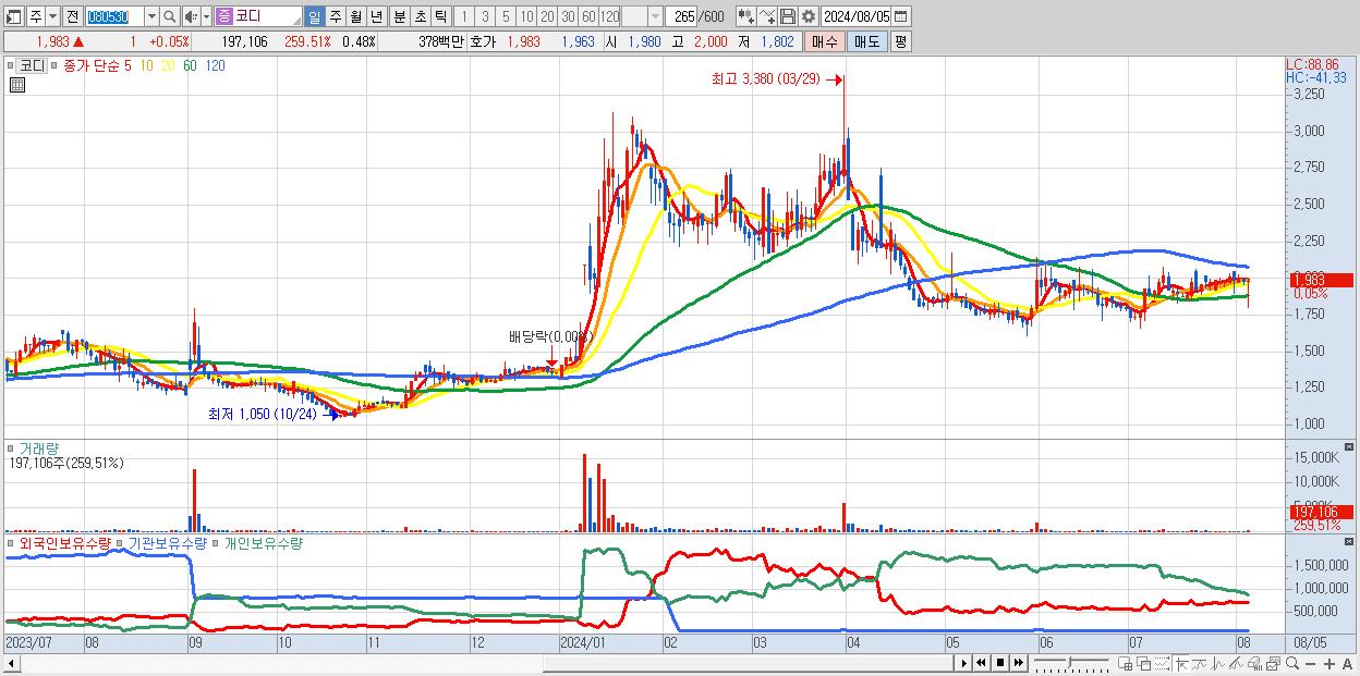 - 코디 (1,983원 ▲ 0.05% , 시총: 808억, 거래량: 197,106, 거래대금:4억)