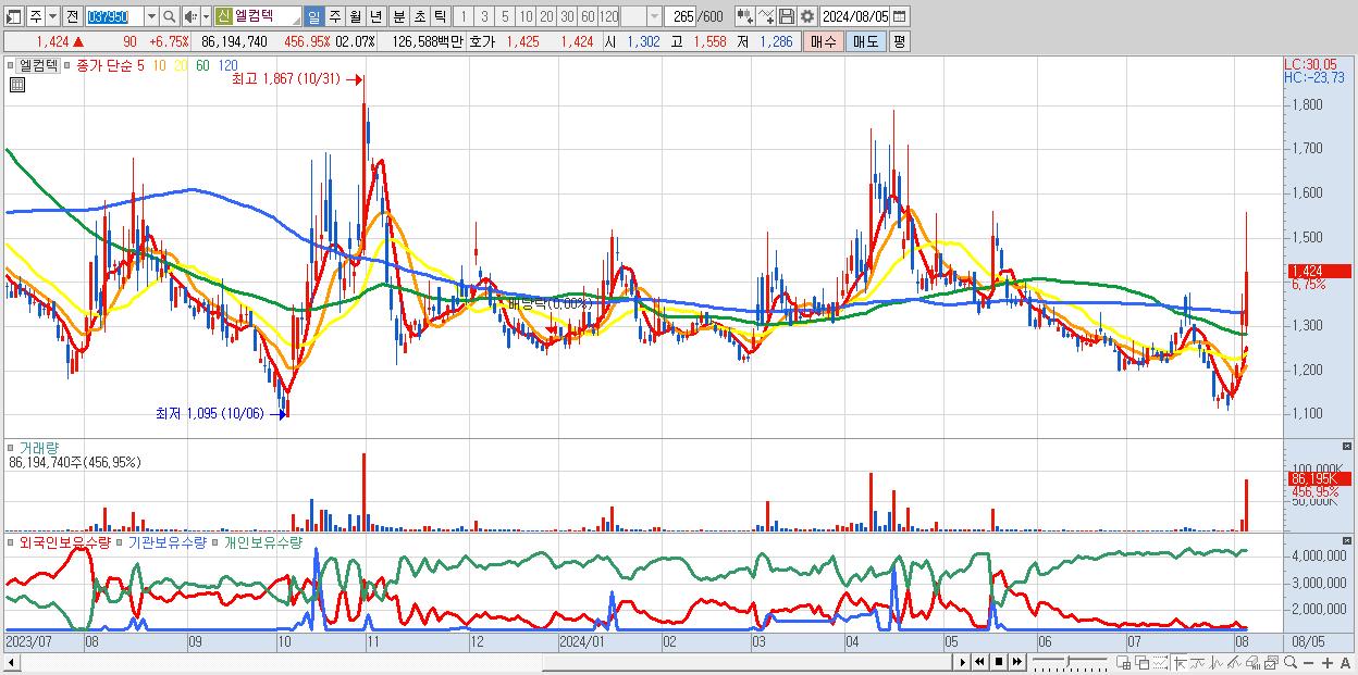 - 엘컴텍 (1,424원 ▲ 6.75% , 시총: 1,203억, 거래량: 86,194,740, 거래대금:1,266억)