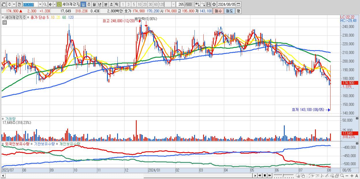 - 세아제강지주 (174,900원 ▲ 1.33% , 시총: 7,244억, 거래량: 17,649, 거래대금:28억)