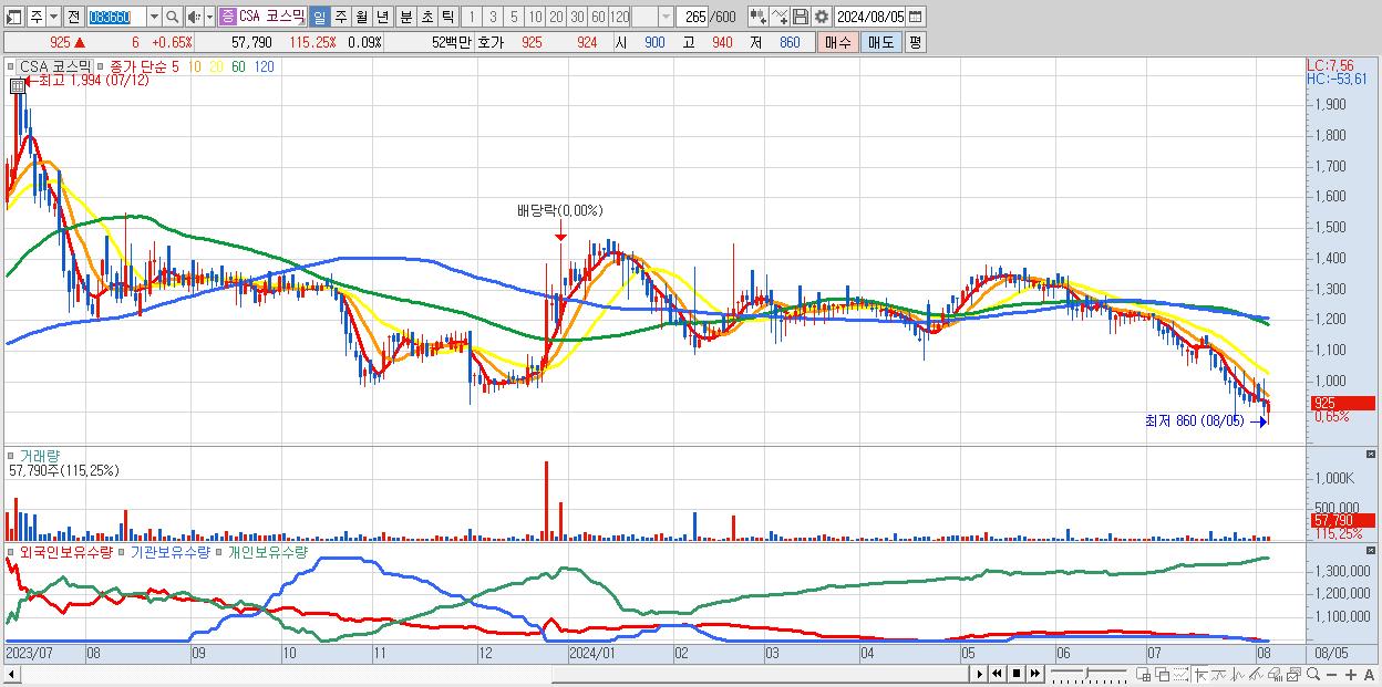 - CSA 코스믹 (925원 ▲ 0.65% , 시총: 567억, 거래량: 57,790, 거래대금:1억)