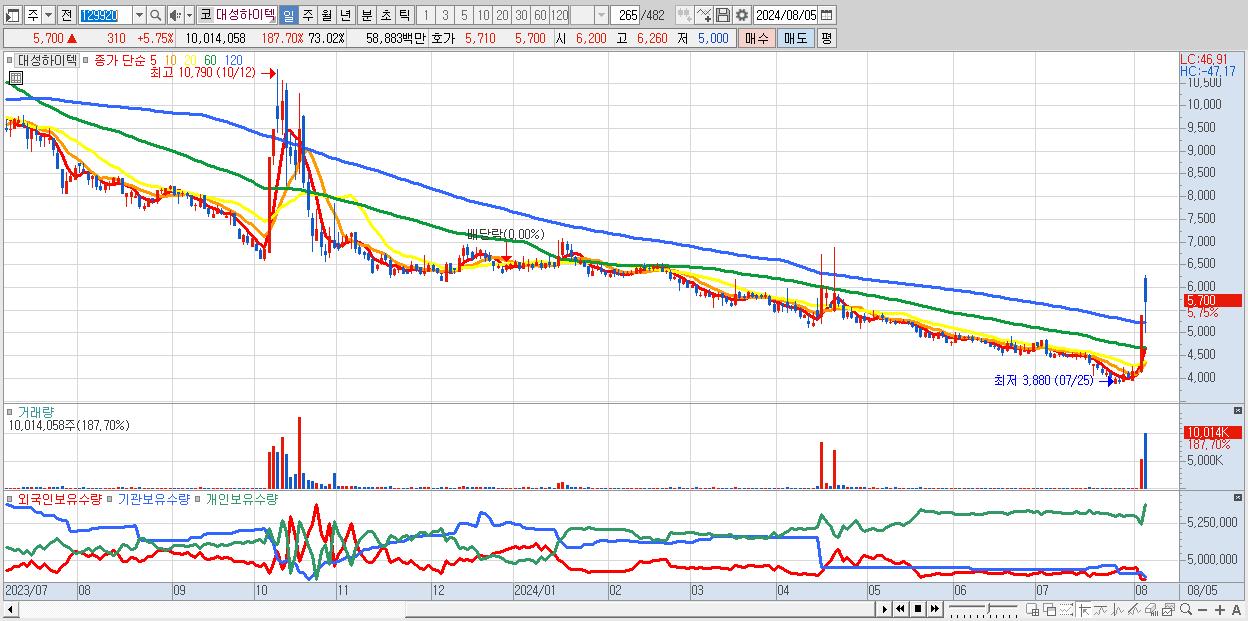 - 대성하이텍 (5,700원 ▲ 5.75% , 시총: 782억, 거래량: 10,014,058, 거래대금:589억)