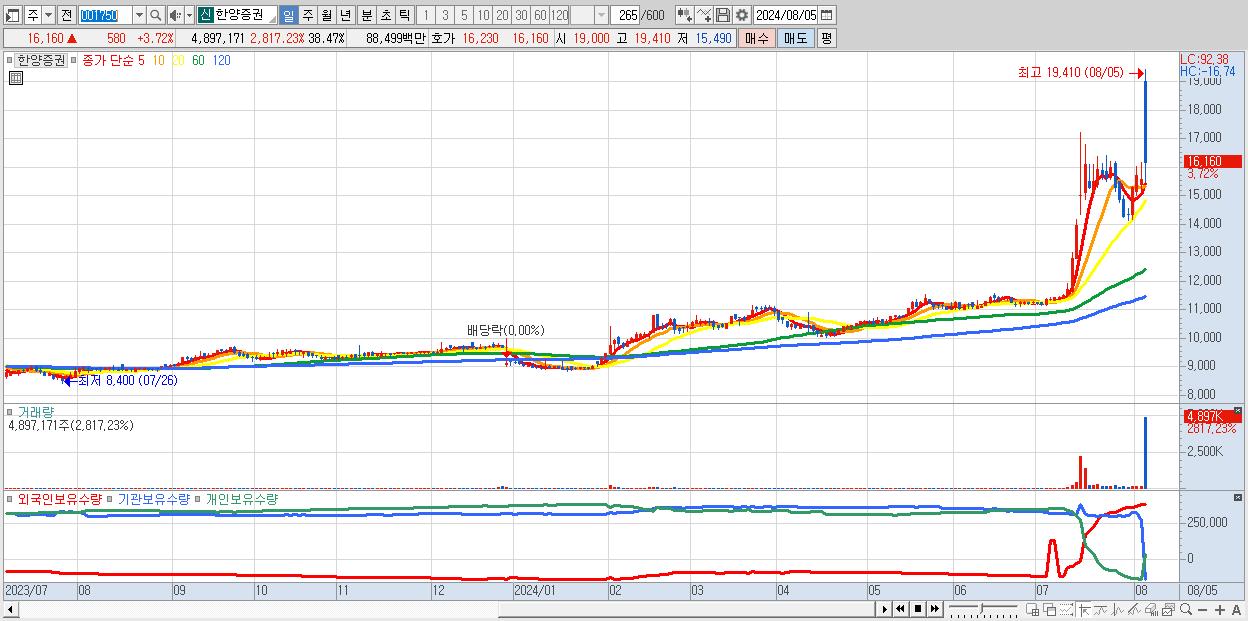 - 한양증권 (16,160원 ▲ 3.72% , 시총: 2,057억, 거래량: 4,897,171, 거래대금:885억)