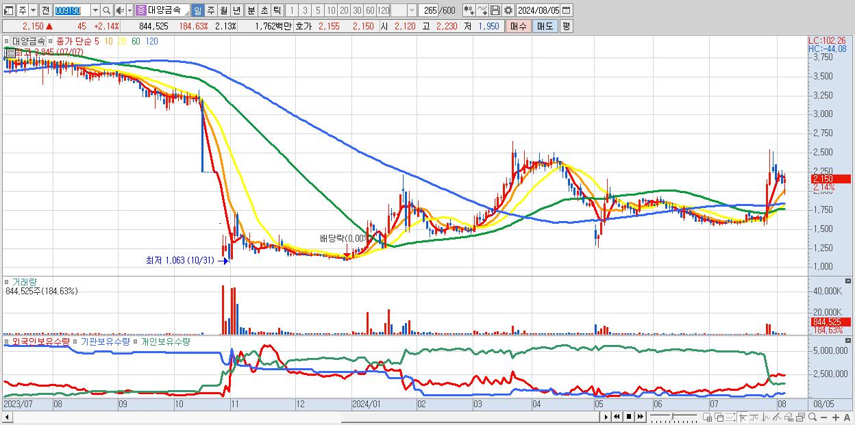 - 대양금속 (2,150원 ▲ 2.14% , 시총: 853억, 거래량: 844,525, 거래대금:18억)