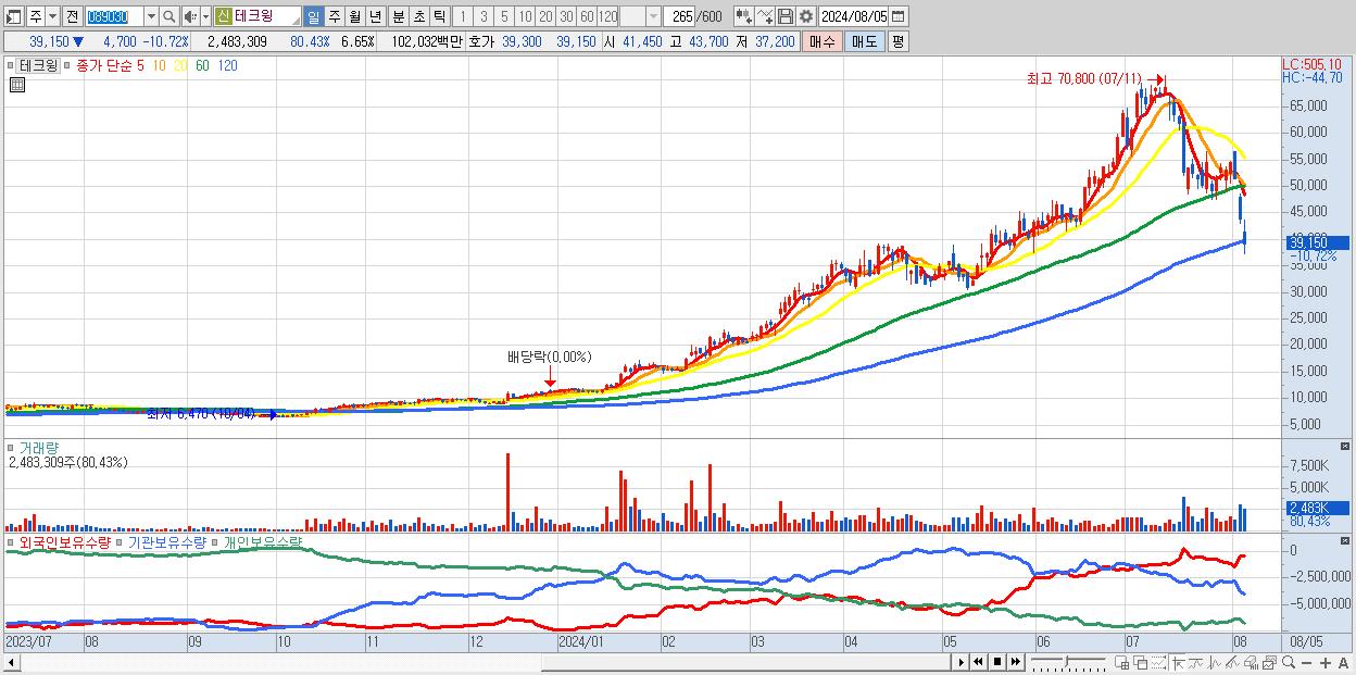 - 테크윙 (39,150원 ▼ -10.72% , 시총: 14,624억, 외국인 순매수 거래금:214억)