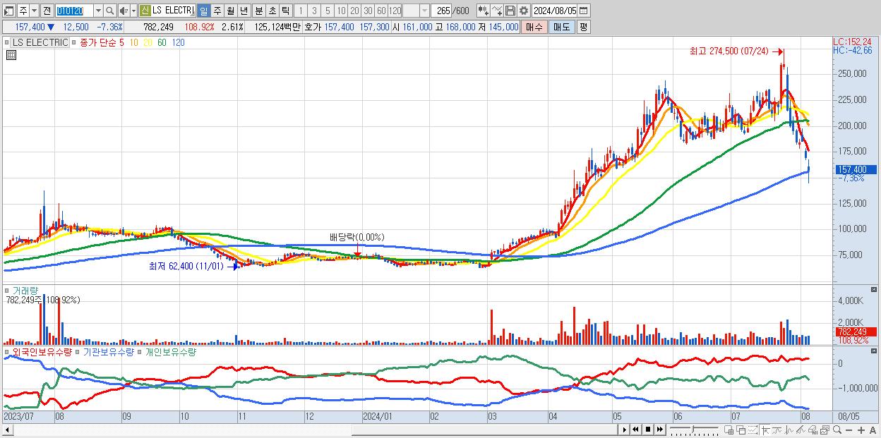 - LS ELECTRIC (157,400원 ▼ -7.36% , 시총: 47,220억, 외국인 순매수 거래금:180억)