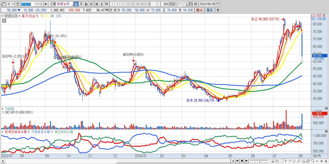 - 보로노이 (58,900원 ▼ -24.29% , 시총: 10,657억, 외국인 순매수 거래금:112억)