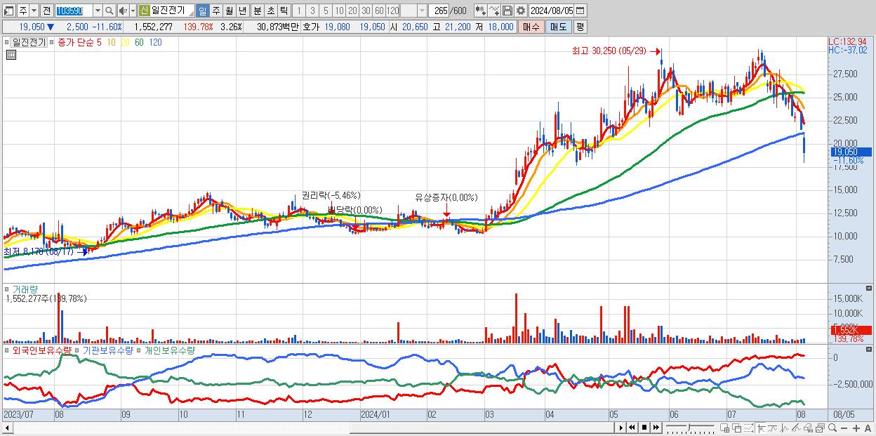 - 일진전기 (19,050원 ▼ -11.6% , 시총: 9,084억, 외국인 순매수 거래금:83억)