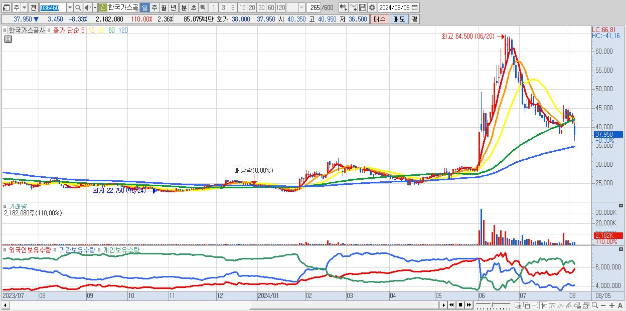 - 한국가스공사 (37,950원 ▼ -8.33% , 시총: 35,033억, 외국인 순매수 거래금:126억)