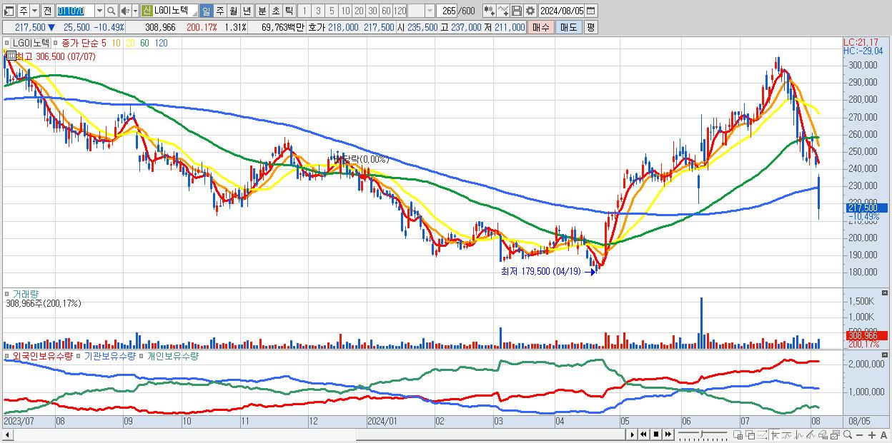 - LG이노텍 (217,500원 ▼ -10.49% , 시총: 51,476억, 외국인 순매수 거래금:115억)