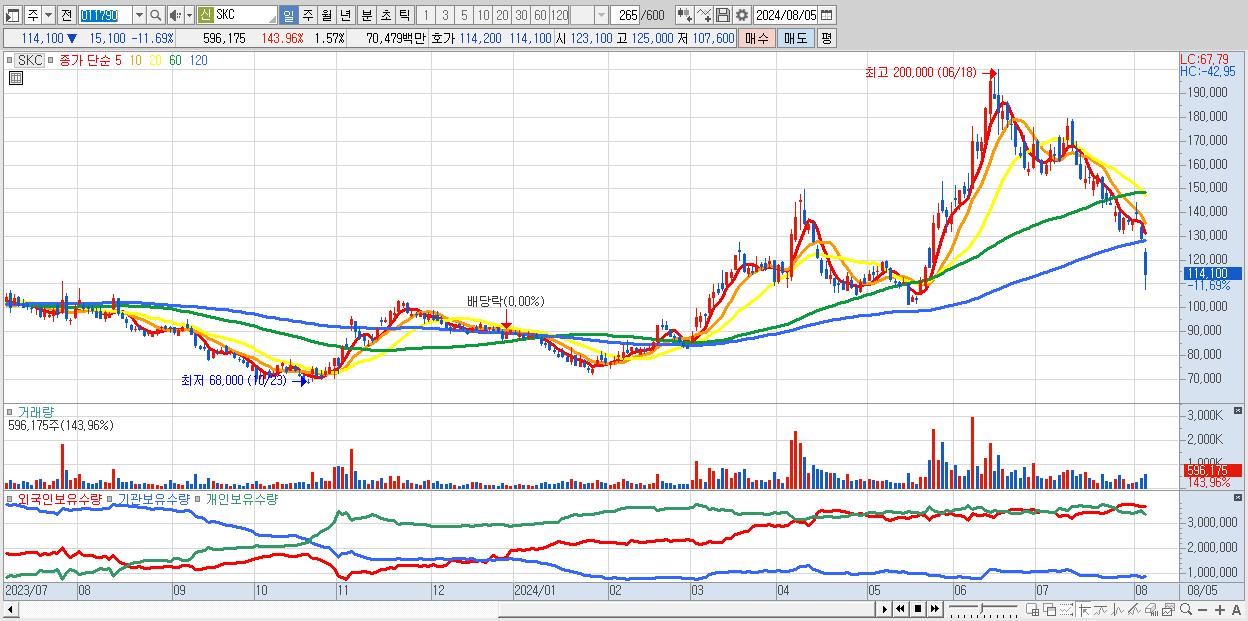 - SKC (114,100원 ▼ -11.69% , 시총: 43,208억, 외국인 순매수 거래금:165억)