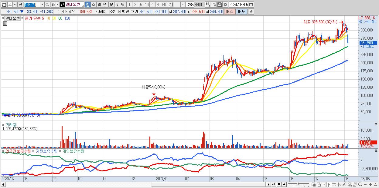 - 알테오젠 (261,500원 ▼ -11.36% , 시총: 138,983억, 외국인 순매수 거래금:386억)