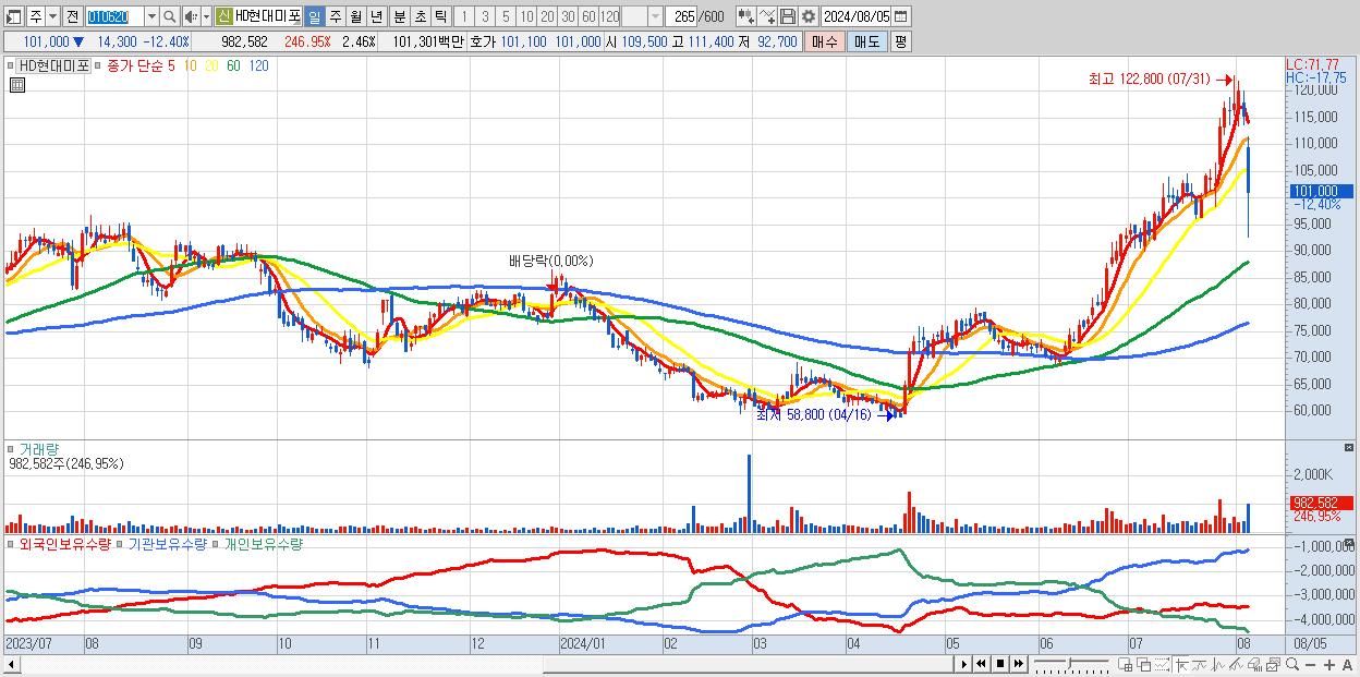 - HD현대미포 (101,000원 ▼ -12.4% , 시총: 40,342억, 외국인 순매수 거래금:89억)
