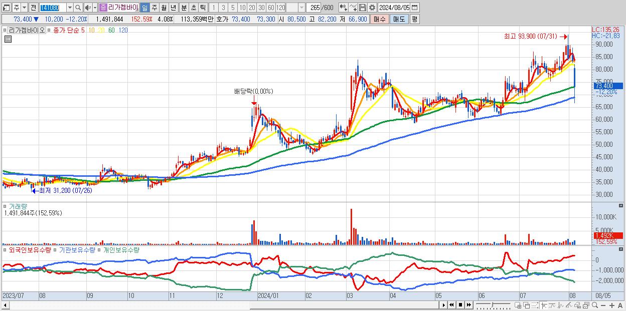 - 리가켐바이오 (73,400원 ▼ -12.2% , 시총: 26,840억, 외국인 순매수 거래금:186억)