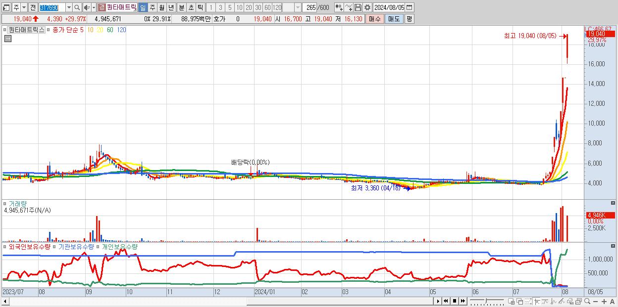 - 퀀타매트릭스 (19,040원 ▲ 29.97% , 시총: 3,149억, 거래량: 4,945,671, 거래대금:890억, KOSDAQ)
