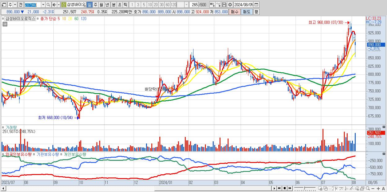 - 삼성바이오로직스 (890,000원 ▼ -2.31% , 시총: 633,449억, 거래량: 251,507, 거래대금:2,252억)