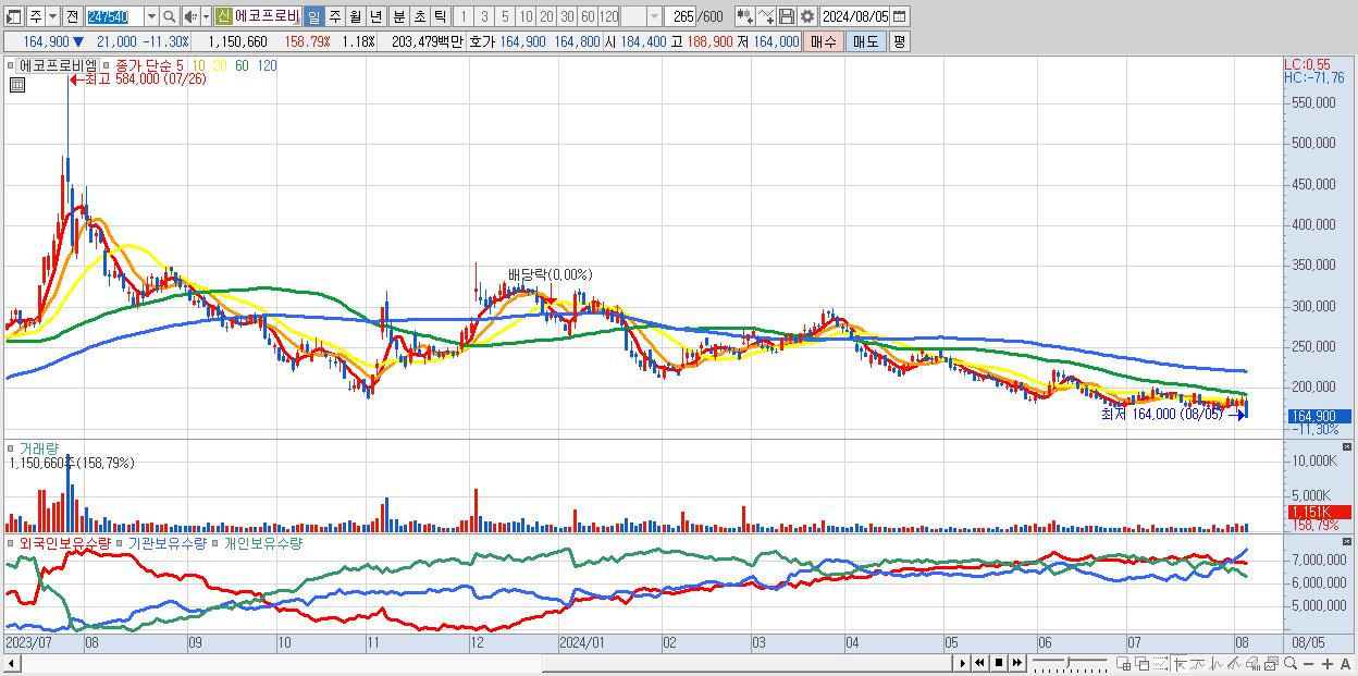 - 에코프로비엠 (164,900원 ▼ -11.3% , 시총: 161,274억, 거래량: 1,150,660, 거래대금:2,035억)