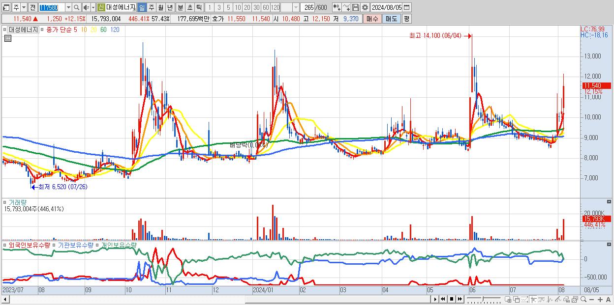 - 대성에너지 (11,540원 ▲ 12.15% , 시총: 3,174억, 거래량: 15,793,004, 거래대금:1,777억)