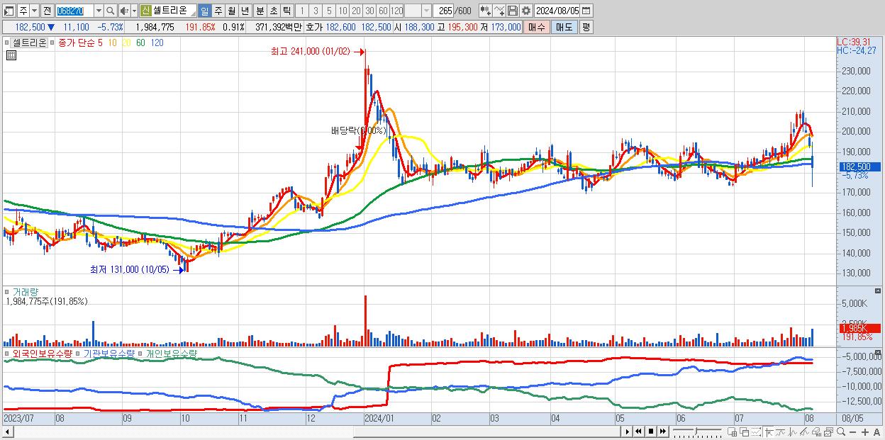 - 셀트리온 (182,500원 ▼ -5.73% , 시총: 396,013억, 거래량: 1,984,775, 거래대금:3,714억)