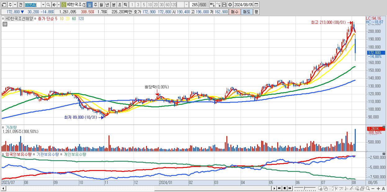 - HD한국조선해양 (172,800원 ▼ -14.88% , 시총: 122,296억, 거래량: 1,261,095, 거래대금:2,262억)