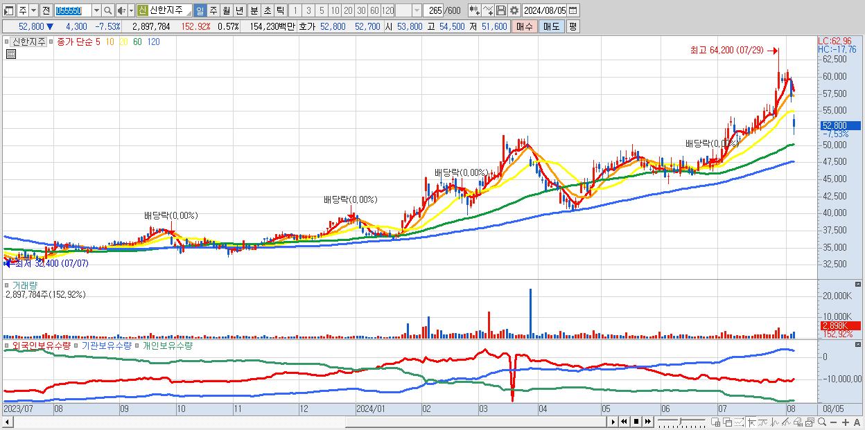 - 신한지주 (52,800원 ▼ -7.53% , 시총: 268,960억, 거래량: 2,897,784, 거래대금:1,542억)