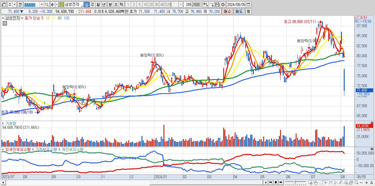 - 삼성전자 (71,400원 ▼ -10.3% , 시총: 4,262,425억, 거래량: 54,608,790, 거래대금:40,285억)