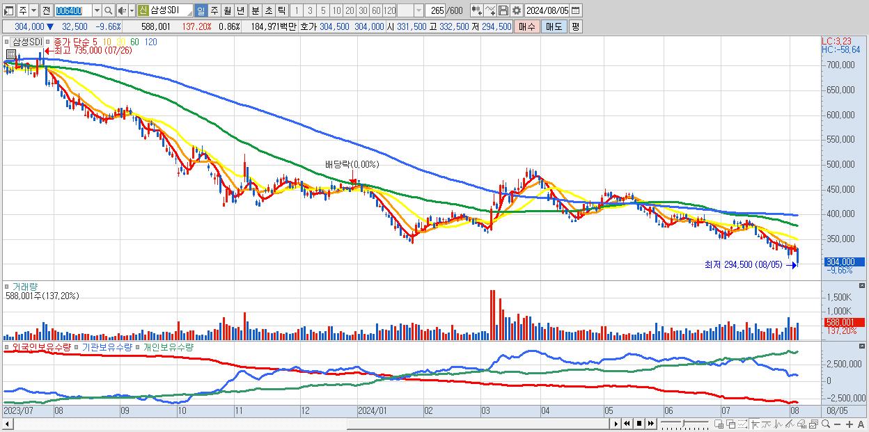 - 삼성SDI (304,000원 ▼ -9.66% , 시총: 209,044억, 거래량: 588,001, 거래대금:1,850억)