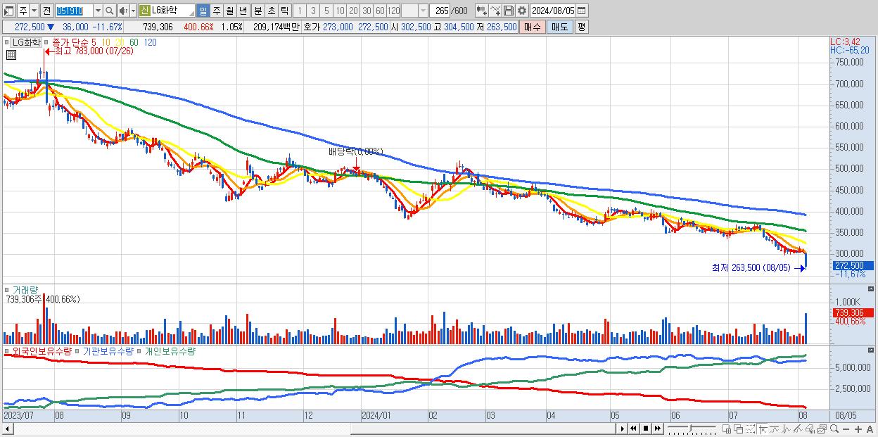 - LG화학 (272,500원 ▼ -11.67% , 시총: 192,364억, 거래량: 739,306, 거래대금:2,092억)
