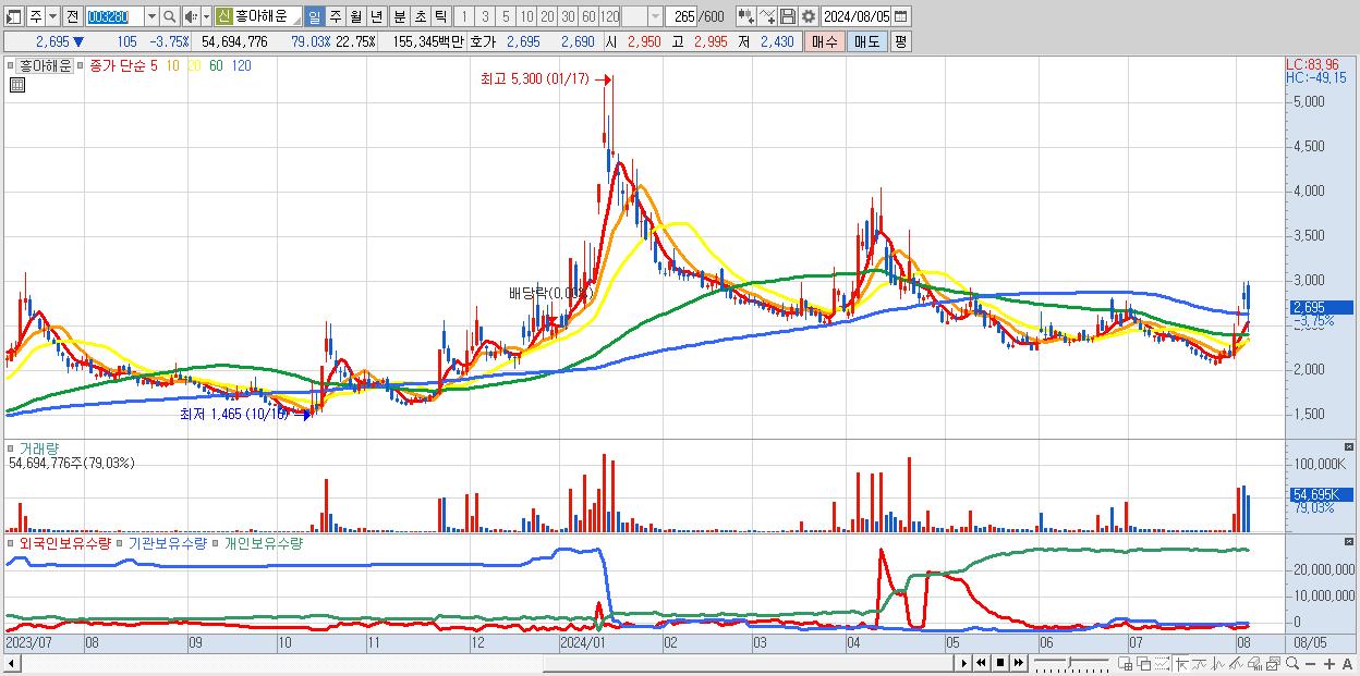 - 흥아해운 (2,695원 ▼ -3.75% , 시총: 6,479억, 거래량: 54,694,776, 거래대금:1,553억)
