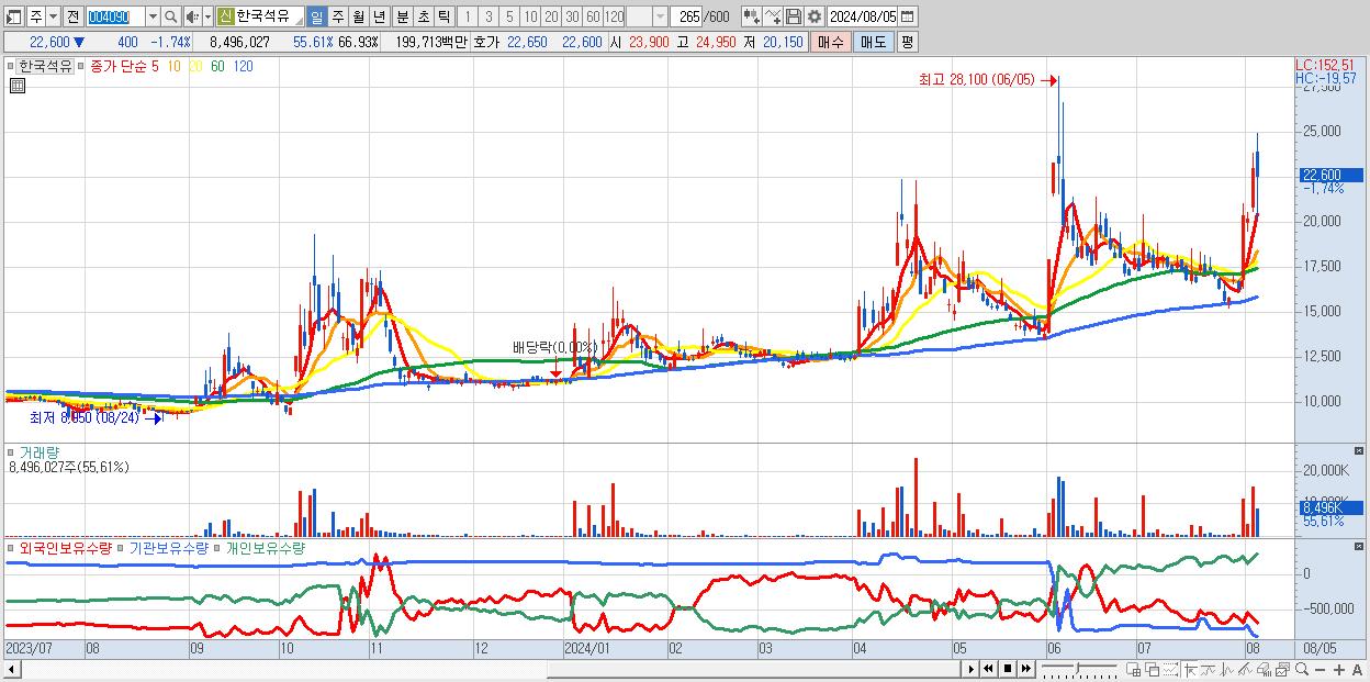 - 한국석유 (22,600원 ▼ -1.74% , 시총: 2,869억, 거래량: 8,496,027, 거래대금:1,997억)