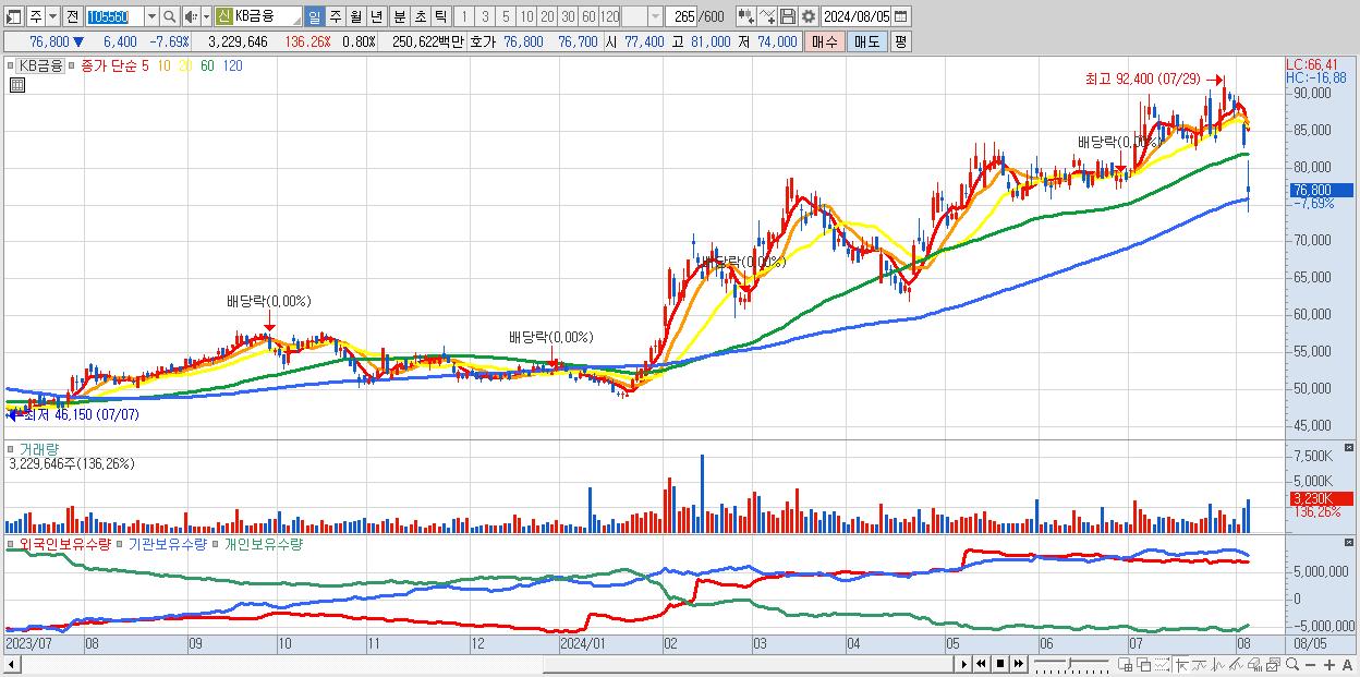 - KB금융 (76,800원 ▼ -7.69% , 시총: 309,897억, 거래량: 3,229,646, 거래대금:2,506억)