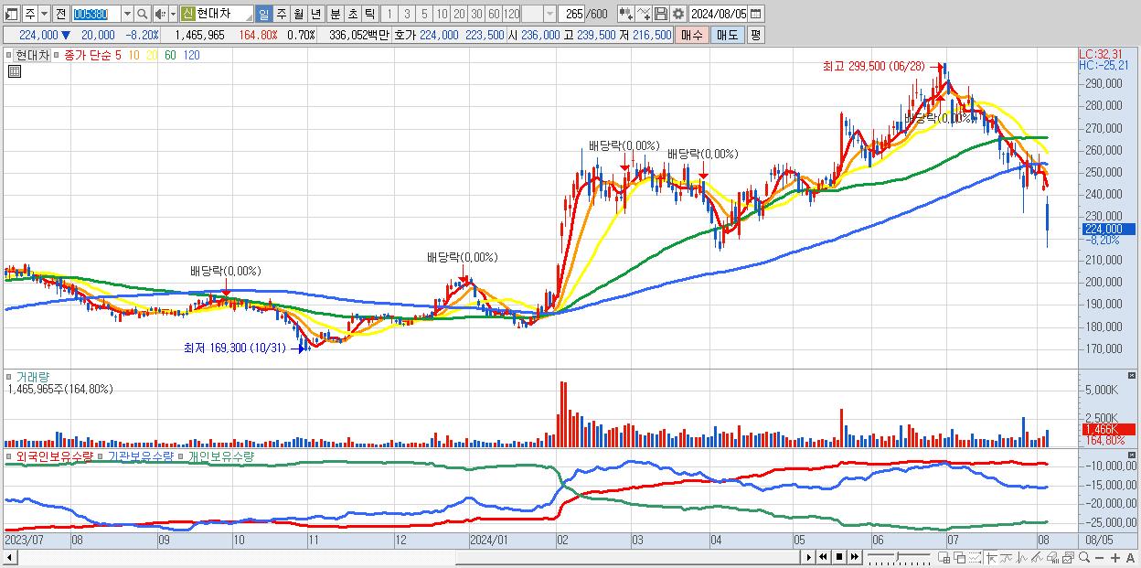 - 현대차 (224,000원 ▼ -8.2% , 시총: 469,092억, 거래량: 1,465,965, 거래대금:3,361억)