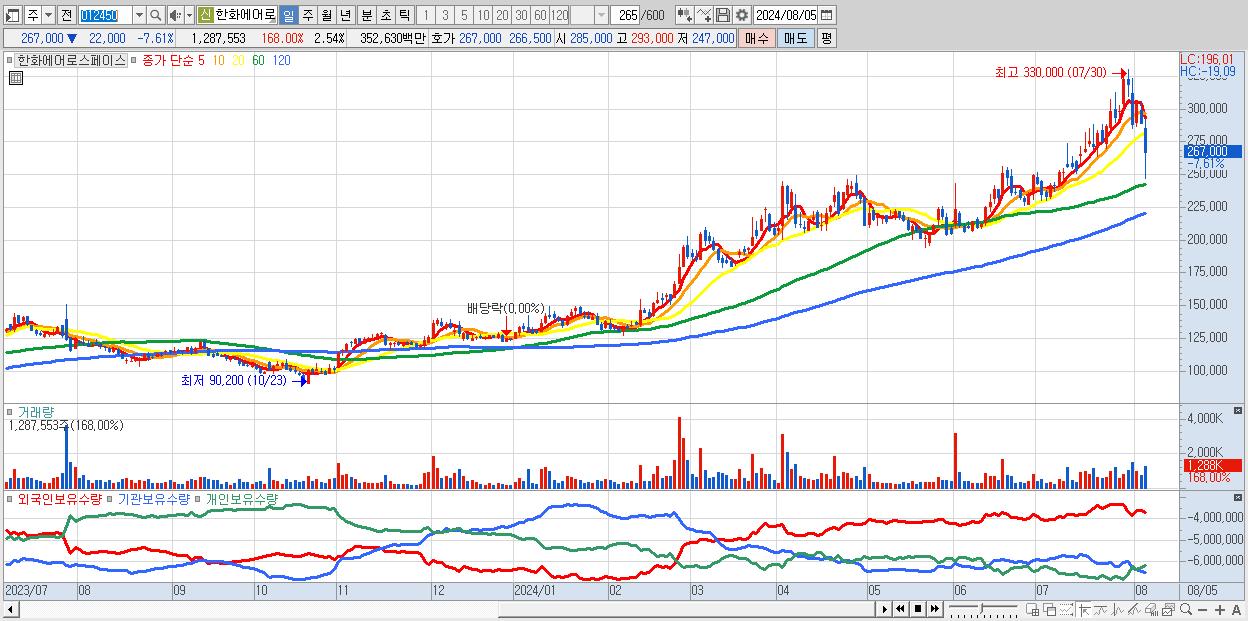- 한화에어로스페이스 (267,000원 ▼ -7.61% , 시총: 135,182억, 거래량: 1,287,553, 거래대금:3,526억)